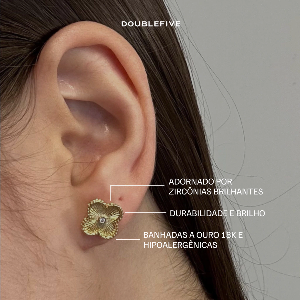 ESSÊNCIA DOUBLEFIVE: Este brinco é um reflexo da mulher que confia no seu potencial e no poder da sorte que constrói ao longo da sua jornada. Com um design que remete à prosperidade e equilíbrio, é para quem abraça cada versão de si mesma e conquista o mundo com graça e autenticidade.